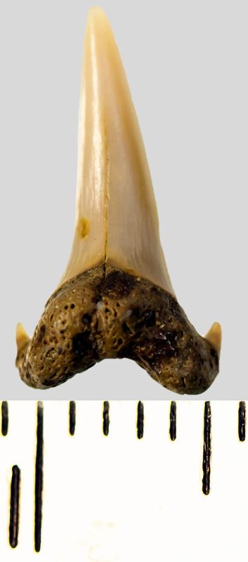 Мелкий боковой зуб с коронкой рыжевато-коричневого цвета, колюще-режущего типа, S-образно изогнутой, с гладким режущим краем. С лингвальной стороны у основания коронки на эмали имеется скульптура в виде слабой продольной струйчатости. Корень охристый, арочный, умеренно массивный, со следами окатанности. Имеется одна питательная борозда с лингвальной стороны корня и одна пара добавочных зубцов коронки.
