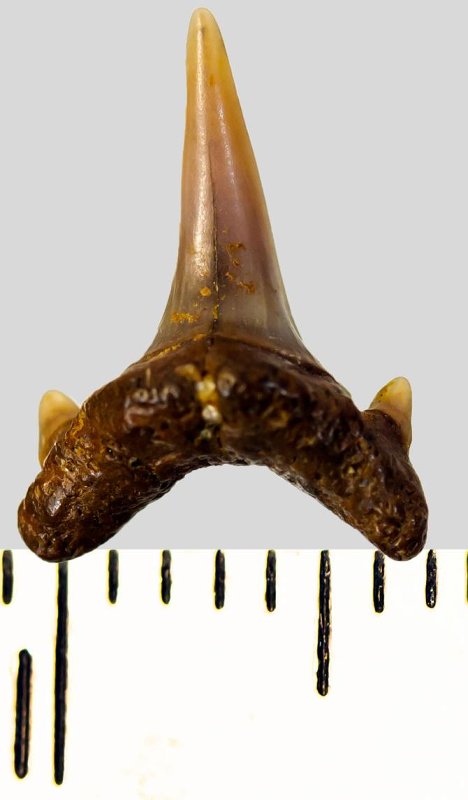 Мелкий боковой зуб с коронкой рыжевато-коричневого цвета, колюще-режущего типа, S-образно изогнутой, с гладким режущим краем. С лингвальной стороны у основания коронки на эмали имеется скульптура в виде слабой продольной струйчатости. Корень охристый, арочный, умеренно массивный, со следами окатанности. Имеется одна питательная борозда с лингвальной стороны корня и одна пара добавочных зубцов коронки.