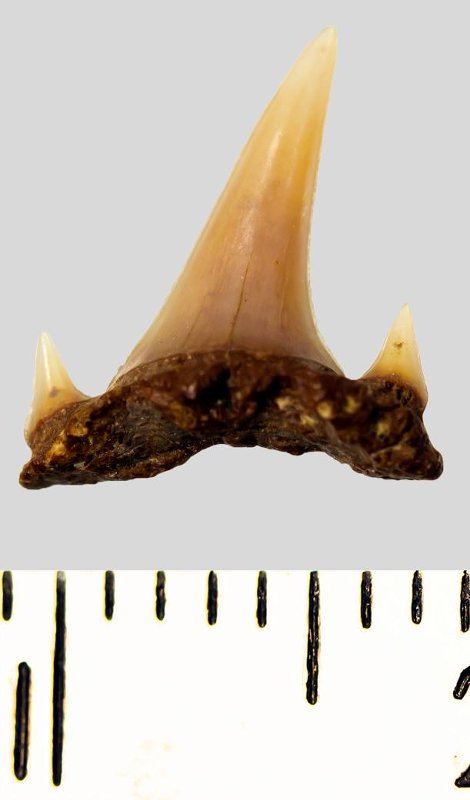 Мелкий боковой зуб с коронкой рыжевато-коричневого цвета, колюще-режущего типа, S-образно изогнутой, с гладким режущим краем. С лингвальной стороны у основания коронки на эмали имеется скульптура в виде слабой продольной струйчатости. Корень охристый, арочный, умеренно массивный, со следами окатанности. Имеется одна питательная борозда с лингвальной стороны корня и одна пара добавочных зубцов коронки.