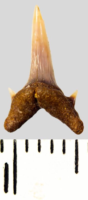 Мелкий боковой зуб с коронкой рыжевато-коричневого цвета, колюще-режущего типа, S-образно изогнутой, с гладким режущим краем. С лингвальной стороны у основания коронки на эмали имеется скульптура в виде слабой продольной струйчатости. Корень охристый, арочный, умеренно массивный, со следами окатанности. Имеется одна питательная борозда с лингвальной стороны корня и одна пара добавочных зубцов коронки.