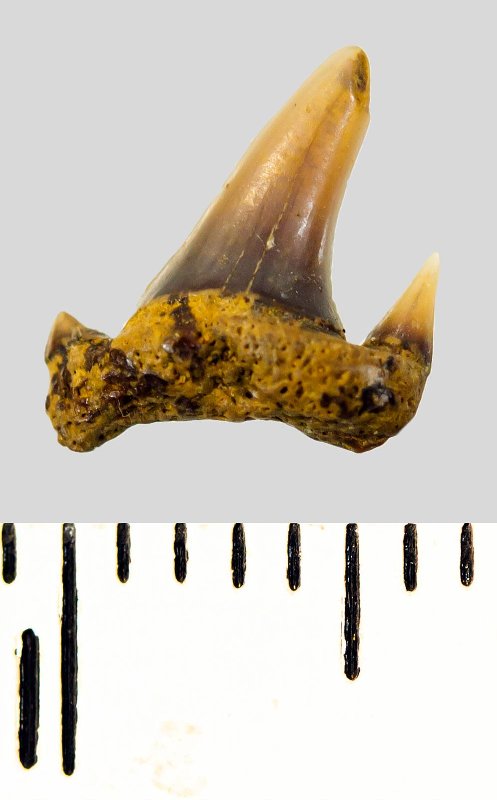 Мелкий боковой зуб с коронкой рыжевато-коричневого цвета, колюще-режущего типа, S-образно изогнутой, с гладким режущим краем. С лингвальной стороны у основания коронки на эмали имеется скульптура в виде слабой продольной струйчатости. Корень охристый, арочный, умеренно массивный, со следами окатанности. Имеется одна питательная борозда с лингвальной стороны корня и одна пара добавочных зубцов коронки.