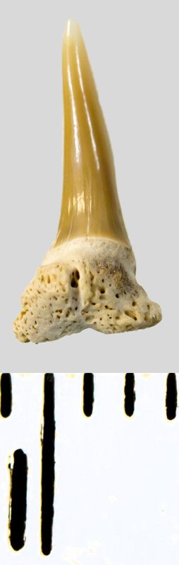 Зуб (фрагмент). Акула. Eostriatolamia subulata (Agassiz, 1843). Классификация: Хордовые Chordata, Позвоночные Vertebrata, Хрящевые рыбы Chondrichthyes, Пластиножаберные Elasmobranchii, Акулы Selachii, Ламнообразные Lamniformes, Песчаные акулы Odontaspididae