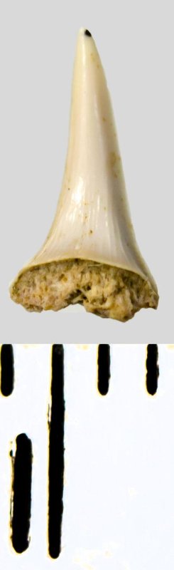 Зуб (фрагмент). Акула. Eostriatolamia subulata (Agassiz, 1843). Классификация: Хордовые Chordata, Позвоночные Vertebrata, Хрящевые рыбы Chondrichthyes, Пластиножаберные Elasmobranchii, Акулы Selachii, Ламнообразные Lamniformes, Песчаные акулы Odontaspididae
