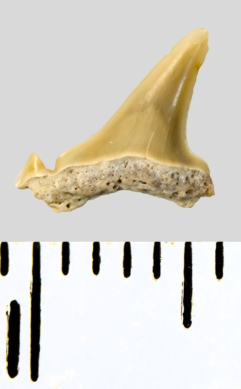 Зуб (фрагмент). Акула. Eostriatolamia subulata (Agassiz, 1843). Классификация: Хордовые Chordata, Позвоночные Vertebrata, Хрящевые рыбы Chondrichthyes, Пластиножаберные Elasmobranchii, Акулы Selachii, Ламнообразные Lamniformes, Песчаные акулы Odontaspididae