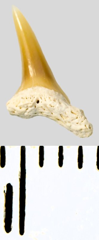 Зуб. Акула. Eostriatolamia subulata (Agassiz, 1843). Классификация: Хордовые Chordata, Позвоночные Vertebrata, Хрящевые рыбы Chondrichthyes, Пластиножаберные Elasmobranchii, Акулы Selachii, Ламнообразные Lamniformes, Песчаные акулы Odontaspididae