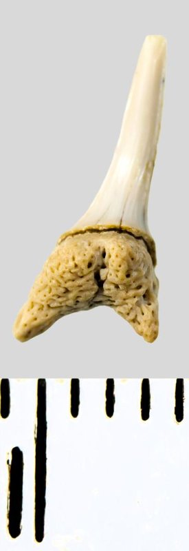 Мелкий зуб с коронкой грязно-белого цвета, колюще-режущего типа, S-образно изогнутой, с гладким режущим краем. С лингвальной стороны у основания коронки на эмали имеется скульптура в виде слабой продольной струйчатости. Корень светлый, серо-кремового цвета, арочный, умеренно массивный, со следами окатанности; правая ветвь сколота. Имеется одна питательная борозда с лингвальной стороны корня. Сохранился правый добавочный зубец коронки.