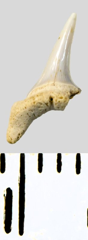 Мелкий боковой зуб с коронкой светло-серого, почти белого цвета, режущего типа, S-образно изогнутой, с гладким режущим краем. С лингвальной стороны у основания коронки на эмали имеется скульптура в виде слабой продольной струйчатости. Корень сливочного цвета, арочный, умеренно массивный, со следами окатанности; правая ветвь сколота. Имеется одна питательная борозда с лингвальной стороны корня. Добавочные зубцы коронки отсутствуют.