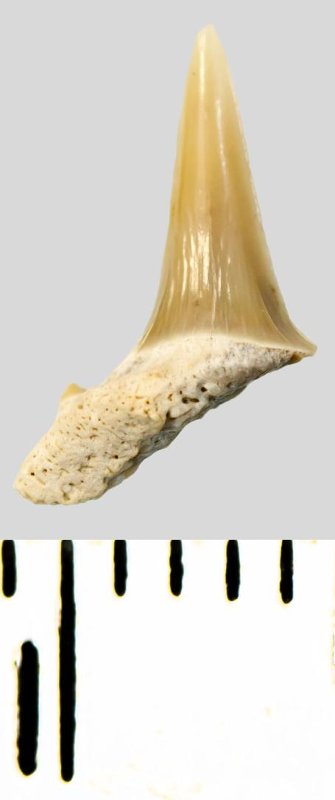 Зуб. Акула. Eostriatolamia subulata (Agassiz, 1843). Классификация: Хордовые Chordata, Позвоночные Vertebrata, Хрящевые рыбы Chondrichthyes, Пластиножаберные Elasmobranchii, Акулы Selachii, Ламнообразные Lamniformes, Песчаные акулы Odontaspididae