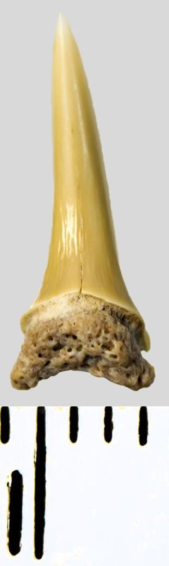 Зуб (фрагмент). Акула. Eostriatolamia subulata (Agassiz, 1843). Классификация: Хордовые Chordata, Позвоночные Vertebrata, Хрящевые рыбы Chondrichthyes, Пластиножаберные Elasmobranchii, Акулы Selachii, Ламнообразные Lamniformes, Песчаные акулы Odontaspididae