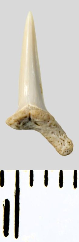 Мелкий боковой зуб с коронкой светло-серого, почти белого цвета, колюще-режущего типа, S-образно изогнутой, с гладким режущим краем. С лингвальной стороны у основания коронки на эмали имеется скульптура в виде слабой продольной струйчатости. Корень светло-серый, арочный, умеренно массивный, со следами окатанности; левая ветвь сколота. Имеется одна питательная борозда с лингвальной стороны корня. Добавочные зубцы коронки отсутствуют.