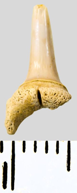 Мелкий боковой зуб с коронкой серовато-сливочного цвета, колюще-режущего типа, S-образно изогнутой, с гладким режущим краем. С лингвальной стороны у основания коронки на эмали имеется скульптура в виде слабой продольной струйчатости. Корень сливочного цвета, арочный, умеренно массивный, со следами окатанности; правая ветвь сколота. Имеется одна питательная борозда с лингвальной стороны корня. Добавочные зубцы коронки отсутствуют.