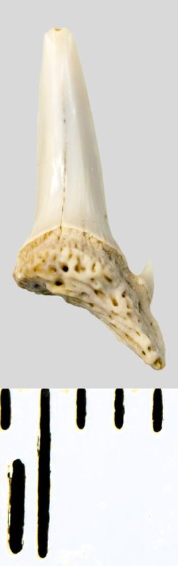 Мелкий боковой зуб с коронкой белого цвета, колюще-режущего типа, S-образно изогнутой, с гладким режущим краем. С лингвальной стороны у основания коронки на эмали имеется скульптура в виде слабой продольной струйчатости. Корень светло-серый, арочный, умеренно массивный, со следами окатанности и эрозии, левая ветвь сколота. Имелась одна пара добавочных зубцов коронки, сохранился только правый.
