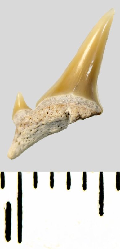 Зуб. Акула. Eostriatolamia subulata (Agassiz, 1843). Классификация: Хордовые Chordata, Позвоночные Vertebrata, Хрящевые рыбы Chondrichthyes, Пластиножаберные Elasmobranchii, Акулы Selachii, Ламнообразные Lamniformes, Песчаные акулы Odontaspididae