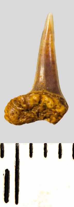 Мелкий боковой зуб с коронкой охристого цвета, колюще-режущего типа, S-образно изогнутой, с гладким режущим краем. С лингвальной стороны у основания коронки на эмали имеется скульптура в виде слабой продольной струйчатости. Корень бурый, арочный, умеренно массивный, со следами окатанности, правая ветвь утрачена. Имеется одна питательная борозда с лингвальной стороны корня. Добавочные зубцы коронки зуба отсутствуют.