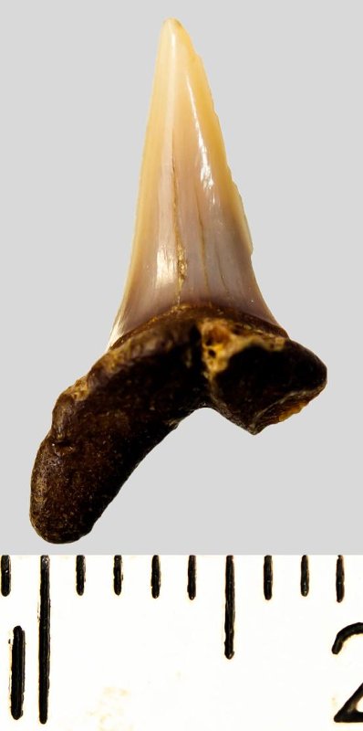 Мелкий боковой зуб с коронкой охристого цвета, колюще-режущего типа, S-образно изогнутой, с гладким режущим краем. С лингвальной стороны у основания коронки на эмали имеется скульптура в виде слабой продольной струйчатости. Корень бурый, арочный, умеренно массивный, со следами окатанности, правая ветвь утрачена. Имеется одна питательная борозда с лингвальной стороны корня. Добавочные зубцы коронки зуба отсутствуют.