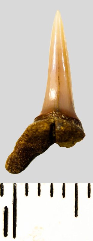 Зуб. Акула. Eostriatolamia subulata (Agassiz, 1843). Классификация: Хордовые Chordata, Позвоночные Vertebrata, Хрящевые рыбы Chondrichthyes, Пластиножаберные Elasmobranchii, Акулы Selachii, Ламнообразные Lamniformes, Песчаные акулы Odontaspididae