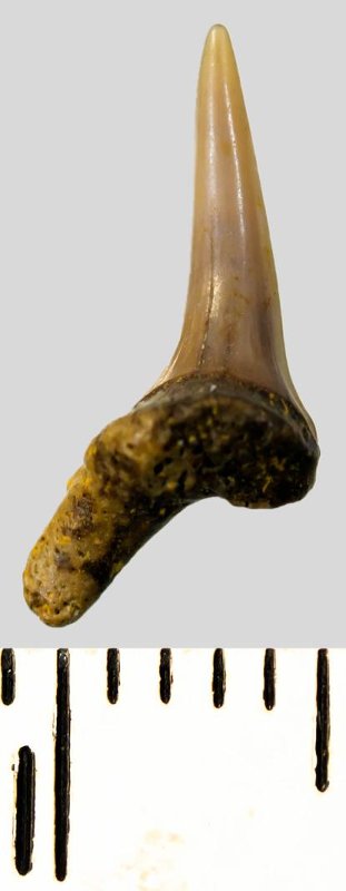 Мелкий боковой зуб с коронкой охристого цвета, колюще-режущего типа, S-образно изогнутой, с гладким режущим краем. С лингвальной стороны у основания коронки на эмали имеется скульптура в виде слабой продольной струйчатости. Корень бурый, арочный, умеренно массивный, со следами окатанности, правая ветвь утрачена. Имеется одна питательная борозда с лингвальной стороны корня. Добавочные зубцы коронки зуба отсутствуют.