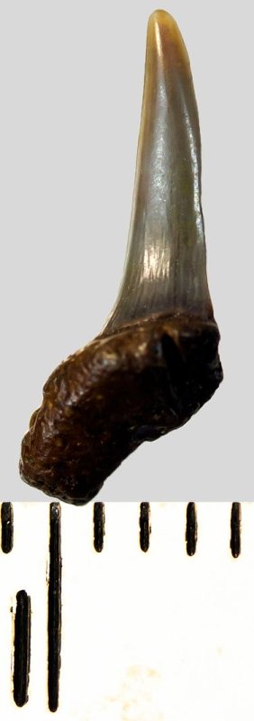 Мелкий боковой зуб с коронкой охристого цвета, колюще-режущего типа, S-образно изогнутой, с гладким режущим краем. С лингвальной стороны у основания коронки на эмали имеется скульптура в виде слабой продольной струйчатости. Корень бурый, арочный, умеренно массивный, со следами окатанности, правая ветвь утрачена. Имеется одна питательная борозда с лингвальной стороны корня. Добавочные зубцы коронки зуба отсутствуют.