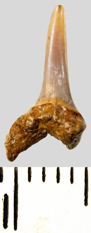 Мелкий боковой зуб с коронкой охристого цвета, колюще-режущего типа, S-образно изогнутой, с гладким режущим краем. С лингвальной стороны у основания коронки на эмали имеется скульптура в виде слабой продольной струйчатости. Корень бурый, арочный, умеренно массивный, со следами окатанности, правая ветвь утрачена. Имеется одна питательная борозда с лингвальной стороны корня. Добавочные зубцы коронки зуба отсутствуют.