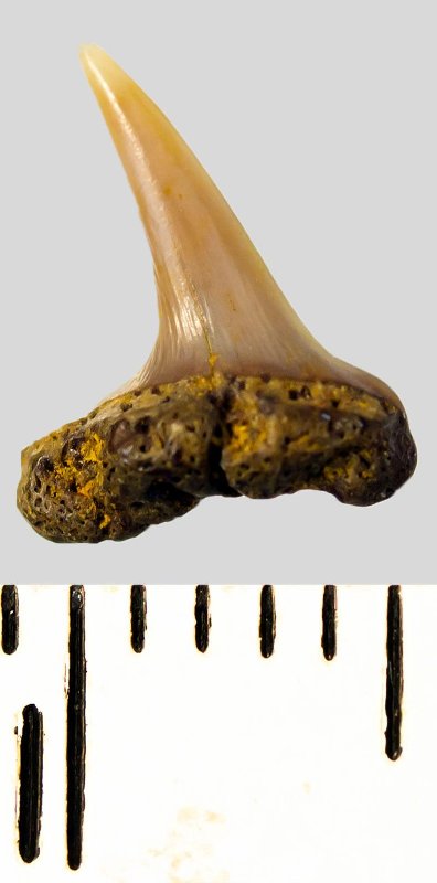 Зуб. Акула. Eostriatolamia subulata (Agassiz, 1843). Классификация: Хордовые Chordata, Позвоночные Vertebrata, Хрящевые рыбы Chondrichthyes, Пластиножаберные Elasmobranchii, Акулы Selachii, Ламнообразные Lamniformes, Песчаные акулы Odontaspididae