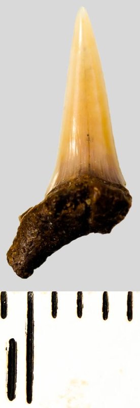 Мелкий боковой зуб с коронкой охристого цвета, колюще-режущего типа, S-образно изогнутой, с гладким режущим краем. С лингвальной стороны у основания коронки на эмали имеется скульптура в виде слабой продольной струйчатости. Корень бурый, арочный, умеренно массивный, со следами окатанности, правая ветвь утрачена. Имеется одна питательная борозда с лингвальной стороны корня. Добавочные зубцы коронки зуба отсутствуют.