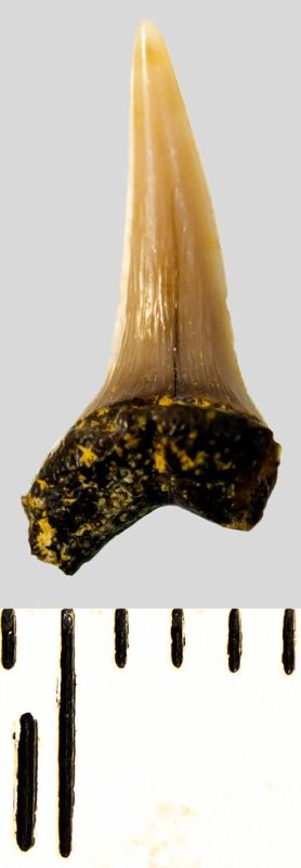 Зуб. Акула. Eostriatolamia subulata (Agassiz, 1843). Классификация: Хордовые Chordata, Позвоночные Vertebrata, Хрящевые рыбы Chondrichthyes, Пластиножаберные Elasmobranchii, Акулы Selachii, Ламнообразные Lamniformes, Песчаные акулы Odontaspididae