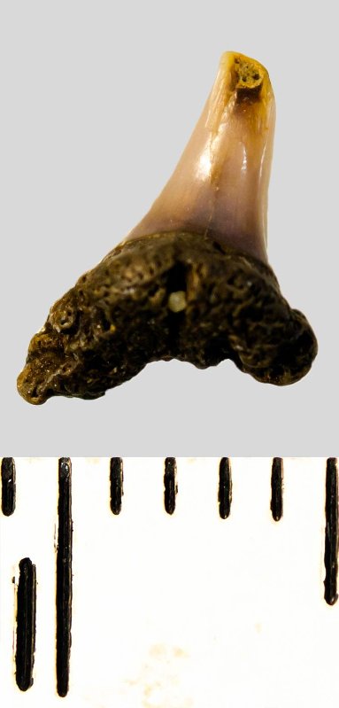 Мелкий боковой зуб с коронкой охристого цвета, колюще-режущего типа, S-образно изогнутой, с гладким режущим краем. С лингвальной стороны у основания коронки на эмали имеется скульптура в виде слабой продольной струйчатости. Корень бурый, арочный, умеренно массивный, со следами окатанности, правая ветвь утрачена. Имеется одна питательная борозда с лингвальной стороны корня. Добавочные зубцы коронки зуба отсутствуют.