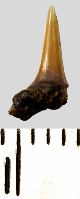Мелкий боковой зуб с коронкой охристого цвета, колюще-режущего типа, S-образно изогнутой, с гладким режущим краем. С лингвальной стороны у основания коронки на эмали имеется скульптура в виде слабой продольной струйчатости. Корень бурый, арочный, умеренно массивный, со следами окатанности, правая ветвь утрачена. Имеется одна питательная борозда с лингвальной стороны корня. Добавочные зубцы коронки зуба отсутствуют.