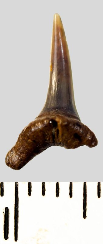 Мелкий боковой зуб с коронкой охристого цвета, колюще-режущего типа, S-образно изогнутой, с гладким режущим краем. С лингвальной стороны у основания коронки на эмали имеется скульптура в виде слабой продольной струйчатости. Корень бурый, арочный, умеренно массивный, со следами окатанности, правая ветвь утрачена. Имеется одна питательная борозда с лингвальной стороны корня. Добавочные зубцы коронки зуба отсутствуют.