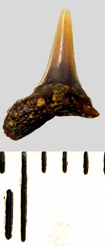 Мелкий боковой зуб с коронкой охристого цвета, колюще-режущего типа, S-образно изогнутой, с гладким режущим краем. С лингвальной стороны у основания коронки на эмали имеется скульптура в виде слабой продольной струйчатости. Корень бурый, арочный, умеренно массивный, со следами окатанности, правая ветвь утрачена. Имеется одна питательная борозда с лингвальной стороны корня. Добавочные зубцы коронки зуба отсутствуют.