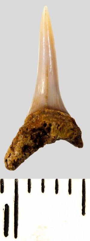 Мелкий боковой зуб с коронкой охристого цвета, колюще-режущего типа, S-образно изогнутой, с гладким режущим краем. С лингвальной стороны у основания коронки на эмали имеется скульптура в виде слабой продольной струйчатости. Корень бурый, арочный, умеренно массивный, со следами окатанности, правая ветвь утрачена. Имеется одна питательная борозда с лингвальной стороны корня. Добавочные зубцы коронки зуба отсутствуют.