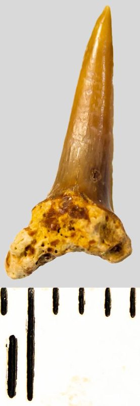 Мелкий боковой зуб с коронкой охристого цвета, колюще-режущего типа, S-образно изогнутой, с гладким режущим краем. С лингвальной стороны у основания коронки на эмали имеется скульптура в виде слабой продольной струйчатости. Корень бурый, арочный, умеренно массивный, со следами окатанности, правая ветвь утрачена. Имеется одна питательная борозда с лингвальной стороны корня. Добавочные зубцы коронки зуба отсутствуют.
