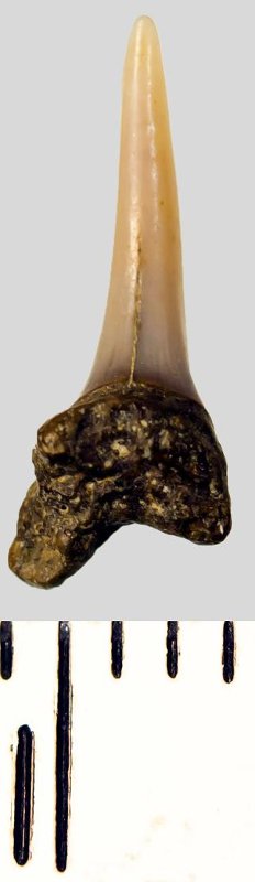 Мелкий боковой зуб с коронкой охристого цвета, колюще-режущего типа, S-образно изогнутой, с гладким режущим краем. С лингвальной стороны у основания коронки на эмали имеется скульптура в виде слабой продольной струйчатости. Корень бурый, арочный, умеренно массивный, со следами окатанности, правая ветвь утрачена. Имеется одна питательная борозда с лингвальной стороны корня. Добавочные зубцы коронки зуба отсутствуют.