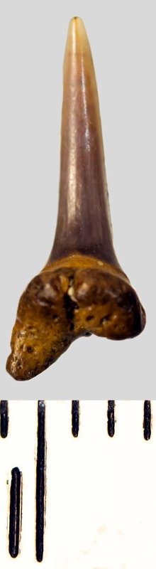 Мелкий боковой зуб с коронкой охристого цвета, колюще-режущего типа, S-образно изогнутой, с гладким режущим краем. С лингвальной стороны у основания коронки на эмали имеется скульптура в виде слабой продольной струйчатости. Корень бурый, арочный, умеренно массивный, со следами окатанности, правая ветвь утрачена. Имеется одна питательная борозда с лингвальной стороны корня. Добавочные зубцы коронки зуба отсутствуют.