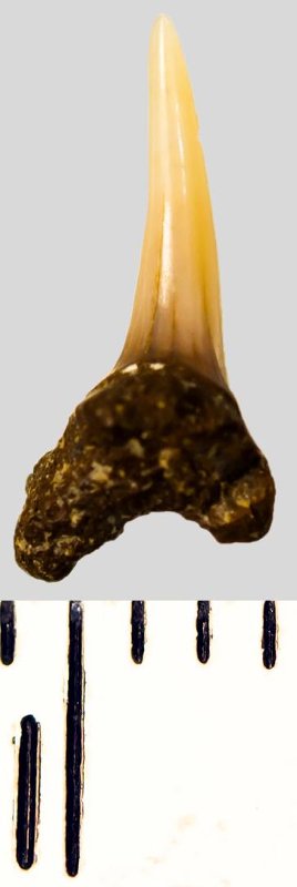Зуб. Акула. Eostriatolamia subulata (Agassiz, 1843). Классификация: Хордовые Chordata, Позвоночные Vertebrata, Хрящевые рыбы Chondrichthyes, Пластиножаберные Elasmobranchii, Акулы Selachii, Ламнообразные Lamniformes, Песчаные акулы Odontaspididae
