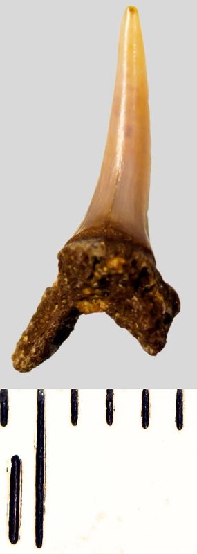 Мелкий боковой зуб с коронкой охристого цвета, колюще-режущего типа, S-образно изогнутой, с гладким режущим краем. С лингвальной стороны у основания коронки на эмали имеется скульптура в виде слабой продольной струйчатости. Корень бурый, арочный, умеренно массивный, со следами окатанности, правая ветвь утрачена. Имеется одна питательная борозда с лингвальной стороны корня. Добавочные зубцы коронки зуба отсутствуют.