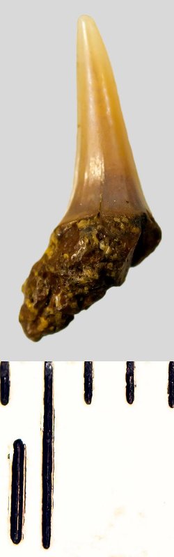 Мелкий боковой зуб с коронкой охристого цвета, колюще-режущего типа, S-образно изогнутой, с гладким режущим краем. С лингвальной стороны у основания коронки на эмали имеется скульптура в виде слабой продольной струйчатости. Корень бурый, арочный, умеренно массивный, со следами окатанности, правая ветвь утрачена. Имеется одна питательная борозда с лингвальной стороны корня. Добавочные зубцы коронки зуба отсутствуют.