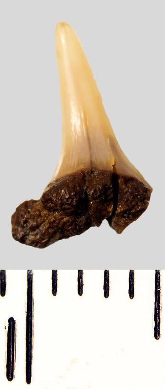 Мелкий боковой зуб с коронкой охристого цвета, колюще-режущего типа, S-образно изогнутой, с гладким режущим краем. С лингвальной стороны у основания коронки на эмали имеется скульптура в виде слабой продольной струйчатости. Корень бурый, арочный, умеренно массивный, со следами окатанности, правая ветвь утрачена. Имеется одна питательная борозда с лингвальной стороны корня. Добавочные зубцы коронки зуба отсутствуют.