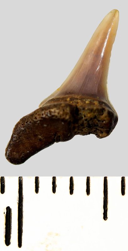 Мелкий боковой зуб с коронкой охристого цвета, колюще-режущего типа, S-образно изогнутой, с гладким режущим краем. С лингвальной стороны у основания коронки на эмали имеется скульптура в виде слабой продольной струйчатости. Корень бурый, арочный, умеренно массивный, со следами окатанности, правая ветвь утрачена. Имеется одна питательная борозда с лингвальной стороны корня. Добавочные зубцы коронки зуба отсутствуют.