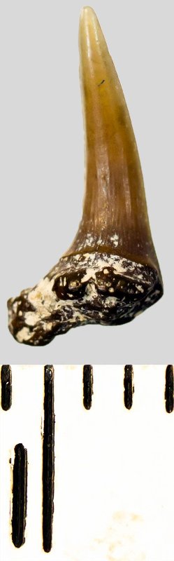 Мелкий боковой зуб с коронкой охристого цвета, колюще-режущего типа, S-образно изогнутой, с гладким режущим краем. С лингвальной стороны у основания коронки на эмали имеется скульптура в виде слабой продольной струйчатости. Корень бурый, арочный, умеренно массивный, со следами окатанности, правая ветвь утрачена. Имеется одна питательная борозда с лингвальной стороны корня. Добавочные зубцы коронки зуба отсутствуют.