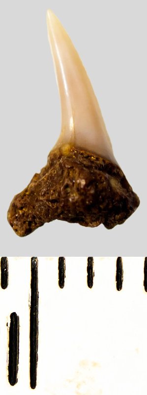 Зуб. Акула. Eostriatolamia subulata (Agassiz, 1843). Классификация: Хордовые Chordata, Позвоночные Vertebrata, Хрящевые рыбы Chondrichthyes, Пластиножаберные Elasmobranchii, Акулы Selachii, Ламнообразные Lamniformes, Песчаные акулы Odontaspididae