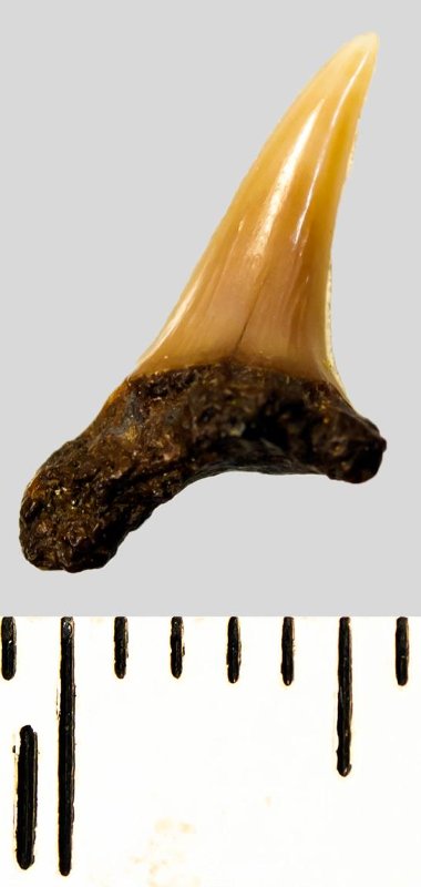 Мелкий боковой зуб с коронкой охристого цвета, колюще-режущего типа, S-образно изогнутой, с гладким режущим краем. С лингвальной стороны у основания коронки на эмали имеется скульптура в виде слабой продольной струйчатости. Корень бурый, арочный, умеренно массивный, со следами окатанности, правая ветвь утрачена. Имеется одна питательная борозда с лингвальной стороны корня. Добавочные зубцы коронки зуба отсутствуют.