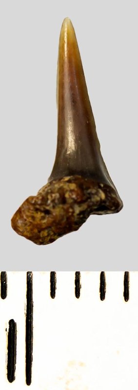 Мелкий боковой зуб с коронкой охристого цвета, колюще-режущего типа, S-образно изогнутой, с гладким режущим краем. С лингвальной стороны у основания коронки на эмали имеется скульптура в виде слабой продольной струйчатости. Корень бурый, арочный, умеренно массивный, со следами окатанности, правая ветвь утрачена. Имеется одна питательная борозда с лингвальной стороны корня. Добавочные зубцы коронки зуба отсутствуют.