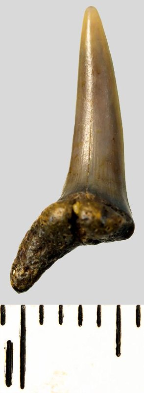 Мелкий боковой зуб с коронкой охристого цвета, колюще-режущего типа, S-образно изогнутой, с гладким режущим краем. С лингвальной стороны у основания коронки на эмали имеется скульптура в виде слабой продольной струйчатости. Корень бурый, арочный, умеренно массивный, со следами окатанности, правая ветвь утрачена. Имеется одна питательная борозда с лингвальной стороны корня. Добавочные зубцы коронки зуба отсутствуют.