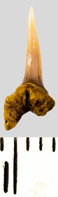 Зуб. Акула. Eostriatolamia subulata (Agassiz, 1843). Классификация: Хордовые Chordata, Позвоночные Vertebrata, Хрящевые рыбы Chondrichthyes, Пластиножаберные Elasmobranchii, Акулы Selachii, Ламнообразные Lamniformes, Песчаные акулы Odontaspididae