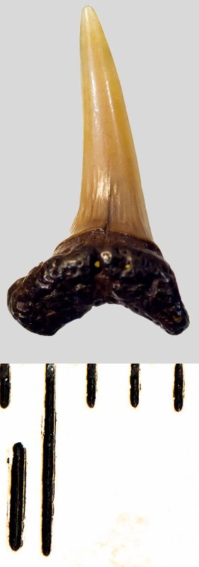 Зуб. Акула. Eostriatolamia subulata (Agassiz, 1843). Классификация: Хордовые Chordata, Позвоночные Vertebrata, Хрящевые рыбы Chondrichthyes, Пластиножаберные Elasmobranchii, Акулы Selachii, Ламнообразные Lamniformes, Песчаные акулы Odontaspididae