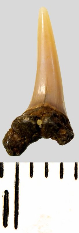 Мелкий боковой зуб с коронкой охристого цвета, колюще-режущего типа, S-образно изогнутой, с гладким режущим краем. С лингвальной стороны у основания коронки на эмали имеется скульптура в виде слабой продольной струйчатости. Корень бурый, арочный, умеренно массивный, со следами окатанности, правая ветвь утрачена. Имеется одна питательная борозда с лингвальной стороны корня. Добавочные зубцы коронки зуба отсутствуют.