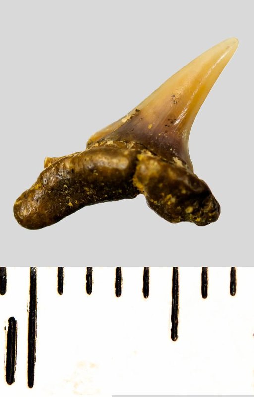 Мелкий боковой зуб с коронкой охристого цвета, колюще-режущего типа, S-образно изогнутой, с гладким режущим краем. С лингвальной стороны у основания коронки на эмали имеется скульптура в виде слабой продольной струйчатости. Корень бурый, арочный, умеренно массивный, со следами окатанности, правая ветвь утрачена. Имеется одна питательная борозда с лингвальной стороны корня. Добавочные зубцы коронки зуба отсутствуют.