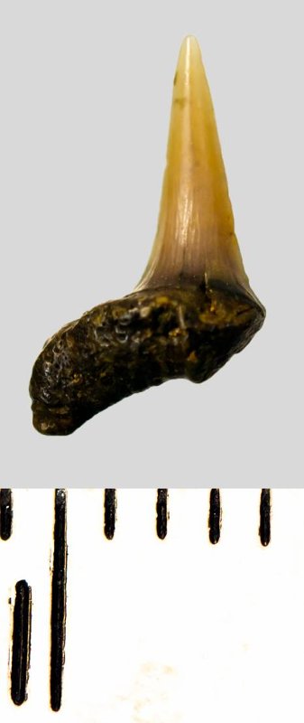 Мелкий боковой зуб с коронкой охристого цвета, колюще-режущего типа, S-образно изогнутой, с гладким режущим краем. С лингвальной стороны у основания коронки на эмали имеется скульптура в виде слабой продольной струйчатости. Корень бурый, арочный, умеренно массивный, со следами окатанности, правая ветвь утрачена. Имеется одна питательная борозда с лингвальной стороны корня. Добавочные зубцы коронки зуба отсутствуют.