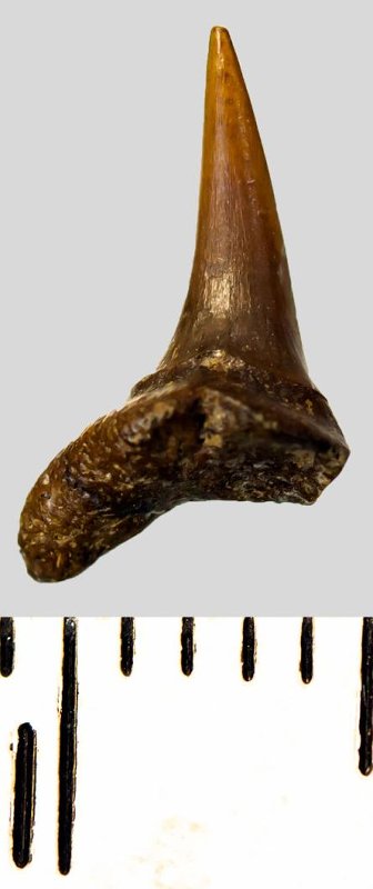 Мелкий боковой зуб с коронкой охристого цвета, колюще-режущего типа, S-образно изогнутой, с гладким режущим краем. С лингвальной стороны у основания коронки на эмали имеется скульптура в виде слабой продольной струйчатости. Корень бурый, арочный, умеренно массивный, со следами окатанности, правая ветвь утрачена. Имеется одна питательная борозда с лингвальной стороны корня. Добавочные зубцы коронки зуба отсутствуют.